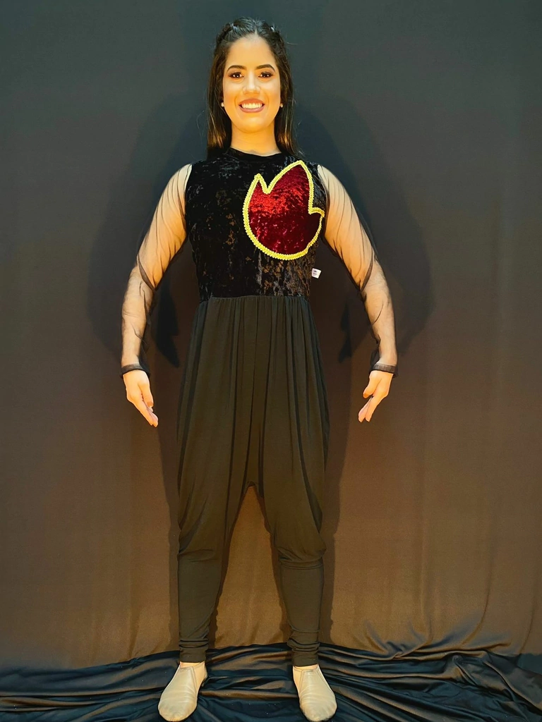 MACACÃO DE VELUDO BUSTO COM CHAMA EM VELUDO E APLIQUE DOURADO E MANGA TULE. CALÇA SARUEL DE MALHA RADIOSA.