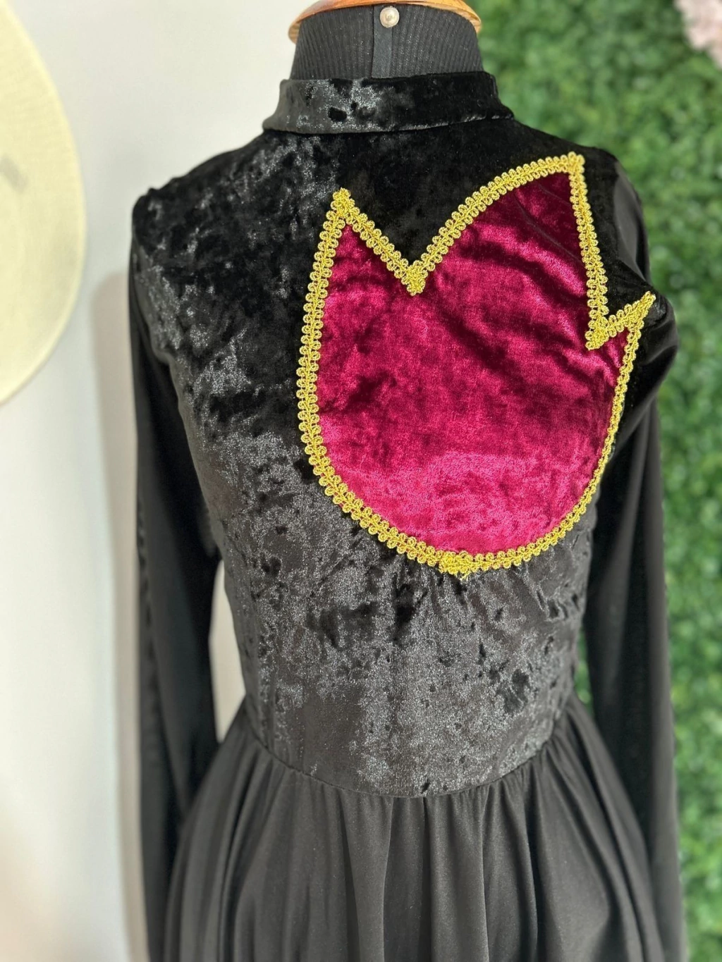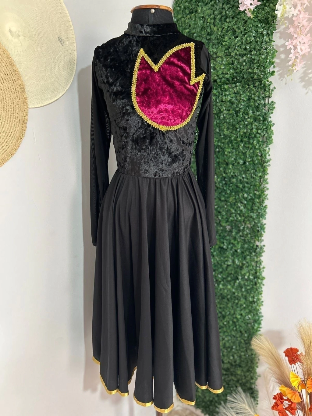 MALHA HELANCA SAIAS COM BUSTO DE VELUDO, MANGA TULE E DETALHE DE CHAMA VELUDO E DOURADO.
