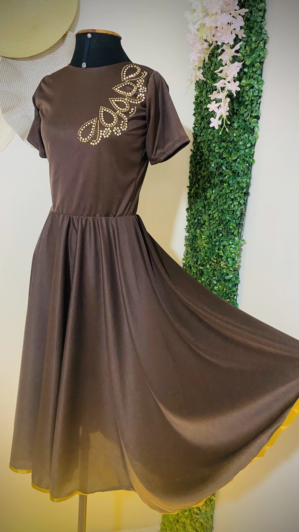 Vestido Dorcas feito em helanca, ideal para quem busca conforto e estilo. Apresenta um elegante aplique dourado no lado esquerdo, com corte godê e forro no busto para melhor caimento. A manga curta e a fita de cetim dourada completam o design inspirado na história de Dorcas.