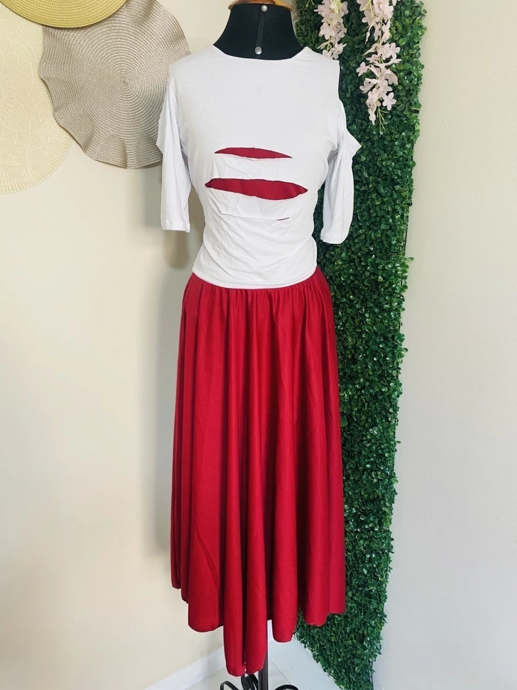VESTIDO DE MALHA RADIOSA BUSTO COM FORRO EM HELANCA, MANGA VAZADA E SAIA CORTE GODÊ EM HELANCA PONTAS.