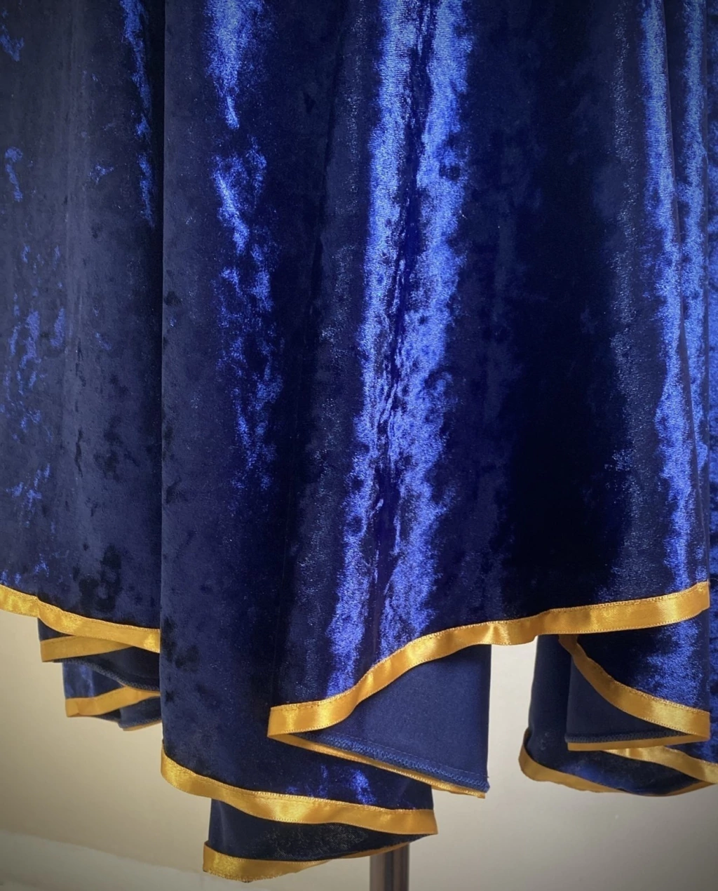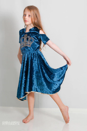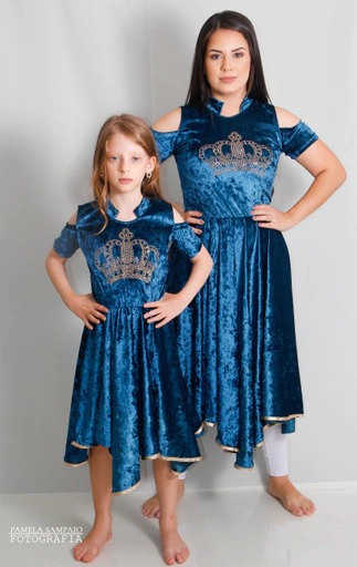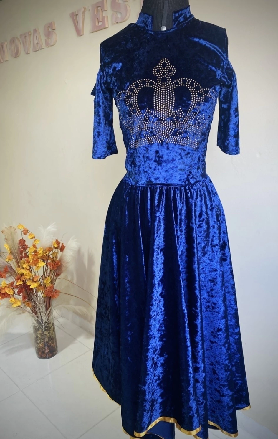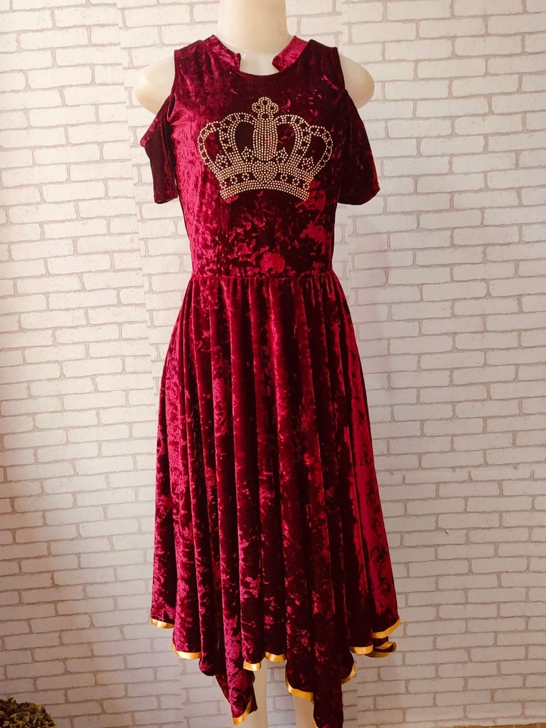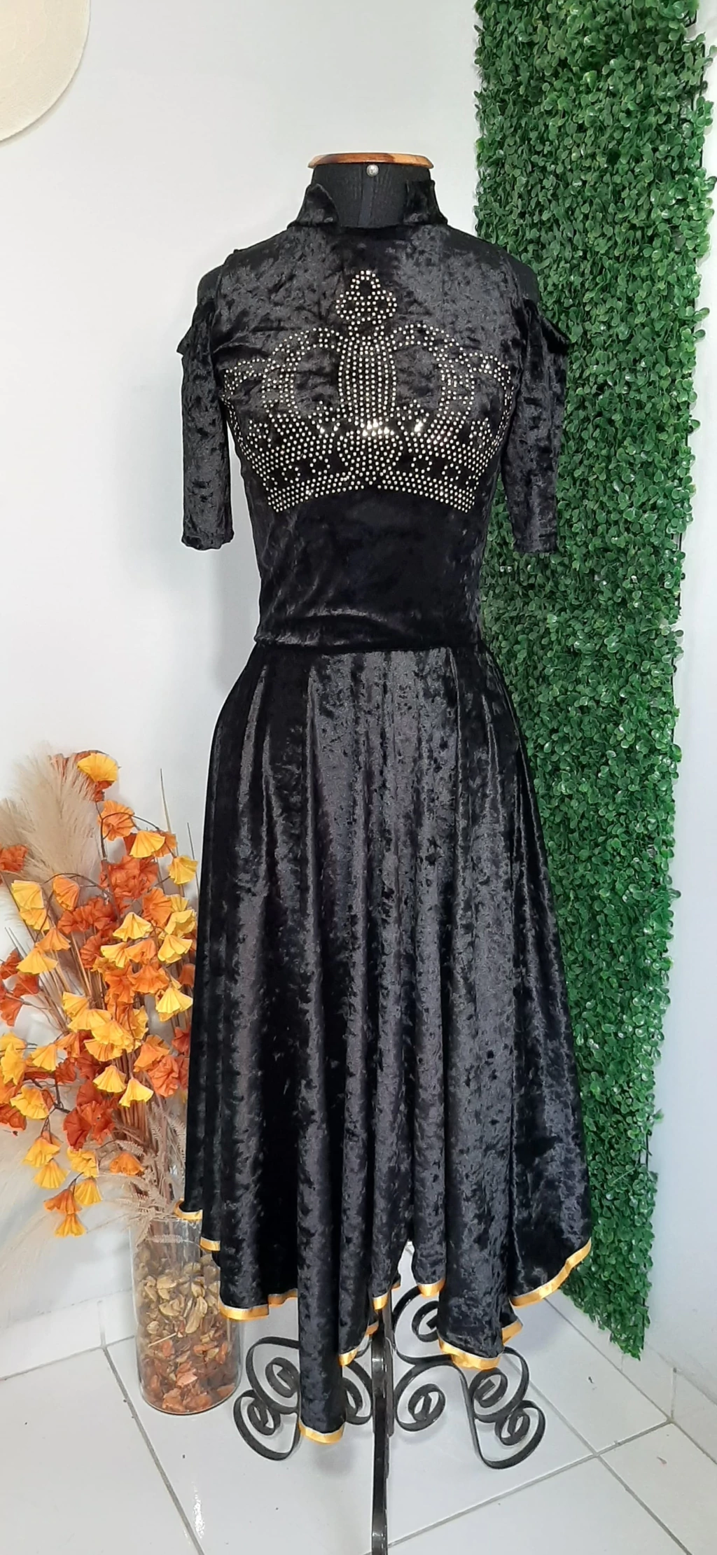Vestido Veludo com aplique busto de coroa e acabamento saia em fita de cetim dourada.